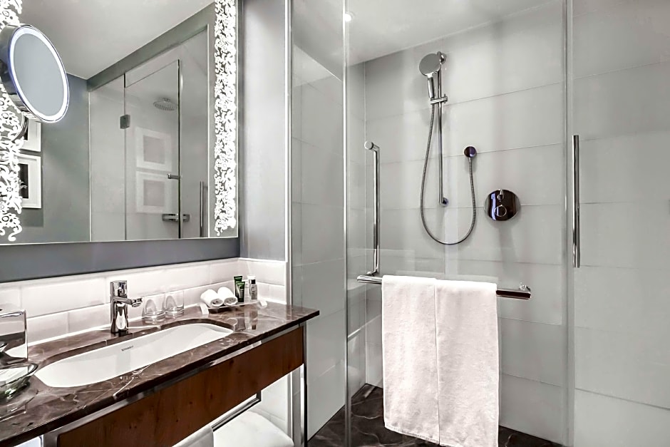 Spacious suite with a separate seating area. It includes a flat-screen TV and a Nespresso coffee machine and 2 free bottles of water. The bathroom offers a bath tub and rain shower as well as luxury toiletries, bathrobe, and slippers.